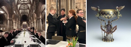 At the end of dinner, a Loving Cup is passed along the dining table with each person saying to their neighbour the school motto 'Inservi Deo et laetare' as they hand the Cup over to take a sip of wine. Whilst taking a sip from the Cup the person is protected from possible enemies by the person standing behind them, which is perfectly shown in the photograph of Toby S, Milly T and Elijah C.